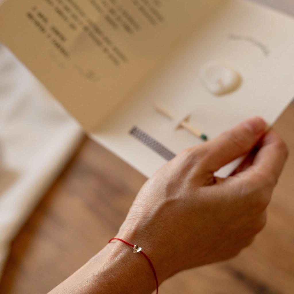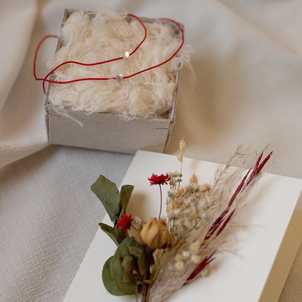 o par da Puslseira Elance, feita em cordão de kunkka com coração que repousa de 0,5 cm, em prata 950 e bolinhas de prata nos terminais, que acompanhará o Cartão Botânico, nele há um mini buque e uma vela para que está data seja ainda mais marcante e especial.