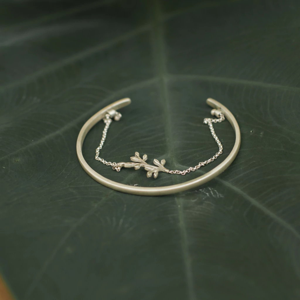 🌿Estrutura tipo bracelete em prata, onde está fixa uma corrente de elo portugues e um galho de folhas central.
